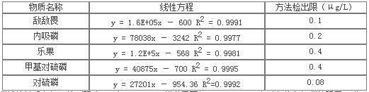 在本方法確定的實(shí)驗(yàn)條件下,移取1.0uL 3.4配置好的有機(jī)磷標(biāo)準(zhǔn)工作溶液,進(jìn)樣檢測(cè),將所得各個(gè)組分的峰面積與相應(yīng)濃度進(jìn)行線性回歸,得各個(gè)組分的線性回歸方程。同時(shí)計(jì)算各個(gè)組分的檢出限,相關(guān)結(jié)果見下表:
