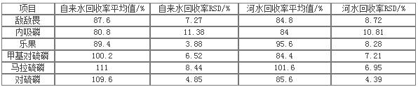 在自來(lái)水和河水中加入0.5ug 6種有機(jī)磷混標(biāo),分別作三次平行樣,按處理樣品的方法進(jìn)行樣品前處理,GC-MS 6800測(cè)試,采用外標(biāo)法定量,計(jì)算其回收率,數(shù)據(jù)見下表: