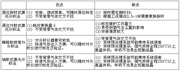 脫硝氨逃逸濃度的量級(jí)一般都是幾個(gè)ppm,對(duì)其準(zhǔn)確測(cè)量比較困難。目前國(guó)內(nèi)外用于煙氣脫硝系統(tǒng)氨逃逸在線監(jiān)測(cè)的方法主要有以下幾種,優(yōu)缺點(diǎn)如下: